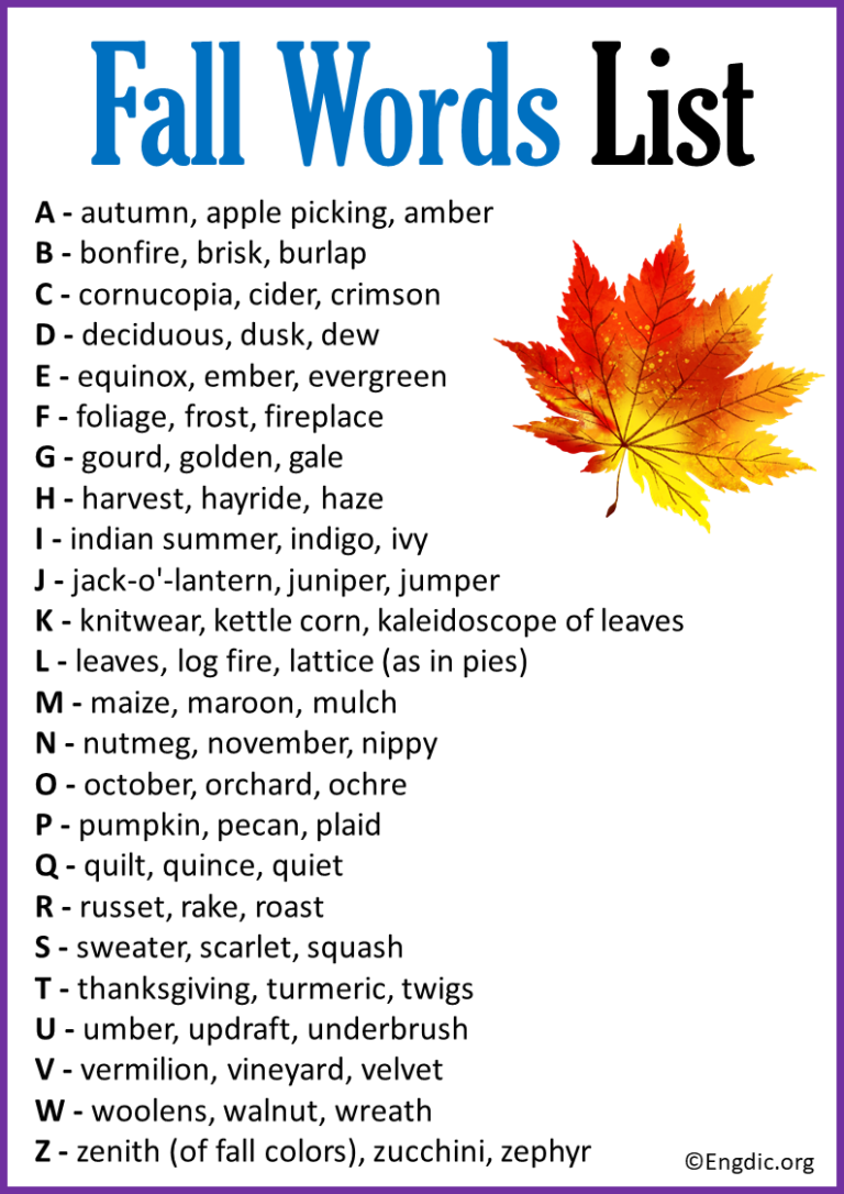 Autumn— осень *Fall (амер.) — осень Autumnal— осенний Autumn season— осенний сезон Autumn leaves— осенние листья Autumn breeze— осенний ветерок Природные явления Golden leaves — золотые листья Leaf fall— листопад Mild autumn — мягкая осень Chilly wind — прохладный ветер Foggy mornings — туманные утра Autumn rain — осенний дождь Harvest time — время сбора урожая Frost — заморозки Mist — туман Dew — роса Погода Cool weather — прохладная погода Cloudy sky — пасмурное небо Drizzling— моросящий дождь Gloomy day — пасмурный день Fresh air — свежий воздух Mild temperature — умеренная температура Autumn chill — осенняя прохлада Осенние месяцы September — сентябрь October — октябрь November — ноябрь Эмоциональные выражения Autumn mood — осеннее настроение Autumn atmosphere — осенняя атмосфера Autumn colors— осенние краски Autumn magic — осенняя магия Autumn beauty — осенняя красота Autumn depression — осенняя депрессия Фрукты и овощи Harvest — урожай Pumpkin — тыква Apple — яблоко Gra