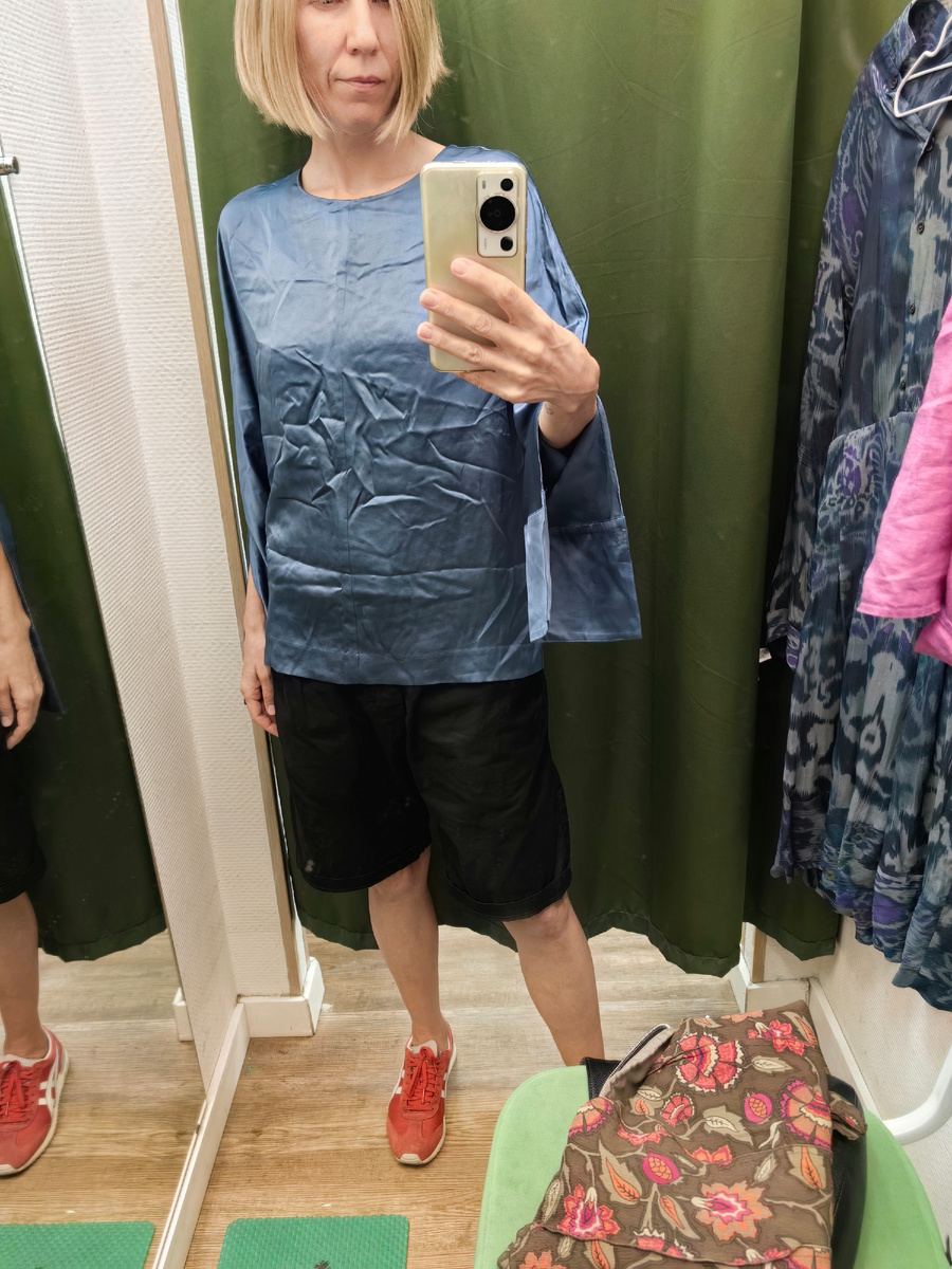 И по традиции покажу мой образ. Те, кто давно меня читает, возможно, узнал блузку - я рассказывала о ней в одной из прошлых статей, это покупка секонд хенд. Это шелк от нашего Питерского модного дома Когель. Ношу ее с большим удовольствием, ее нарядность я немного успокоила, подвернув рукава, да и кроссовки уравновешивают образ.