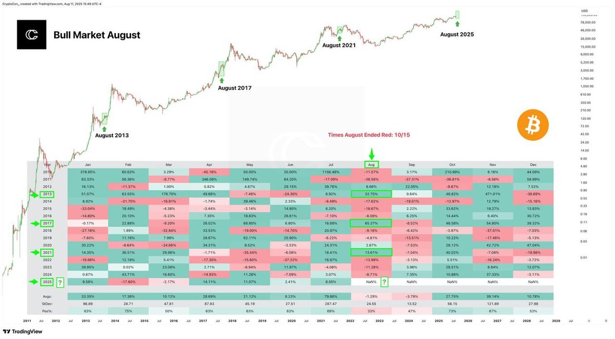 Август: красный по статистике, зелёный в финальном аккорде Исторически август для биткоина — месяц с самым высоким шансом закрыться в минусе. За 15 лет в 10 случаях он был красным. Но есть одно исключение: последний год цикла. 2013, 2017, 2021 — каждый из этих августов оказался бычьим. И это не просто совпадение: в финальный год цикла рынок обычно уже на взводе, ликвидность перетекает в биткоин, а сезонная слабость сдувается под давлением FOMO. Да, в этом году сезонность уже ломала привычные паттерны: февраль, который считался «самым зелёным» месяцем за всю историю, вдруг оказался медвежьим. Но даже с этим сбоем картинка на август 2025 выглядит оптимистично. На что стоит обратить внимание? Если сценарий повторится, август может стать трамплином к финальному импульсу цикла. Но помним: в конце цикла рост — это не просто радость, а и прелюдия к большой волатильности. Хотите разберём, как действовать в финальные месяцы цикла, чтобы не попасть в эйфорию и не остаться с убытками? Постав