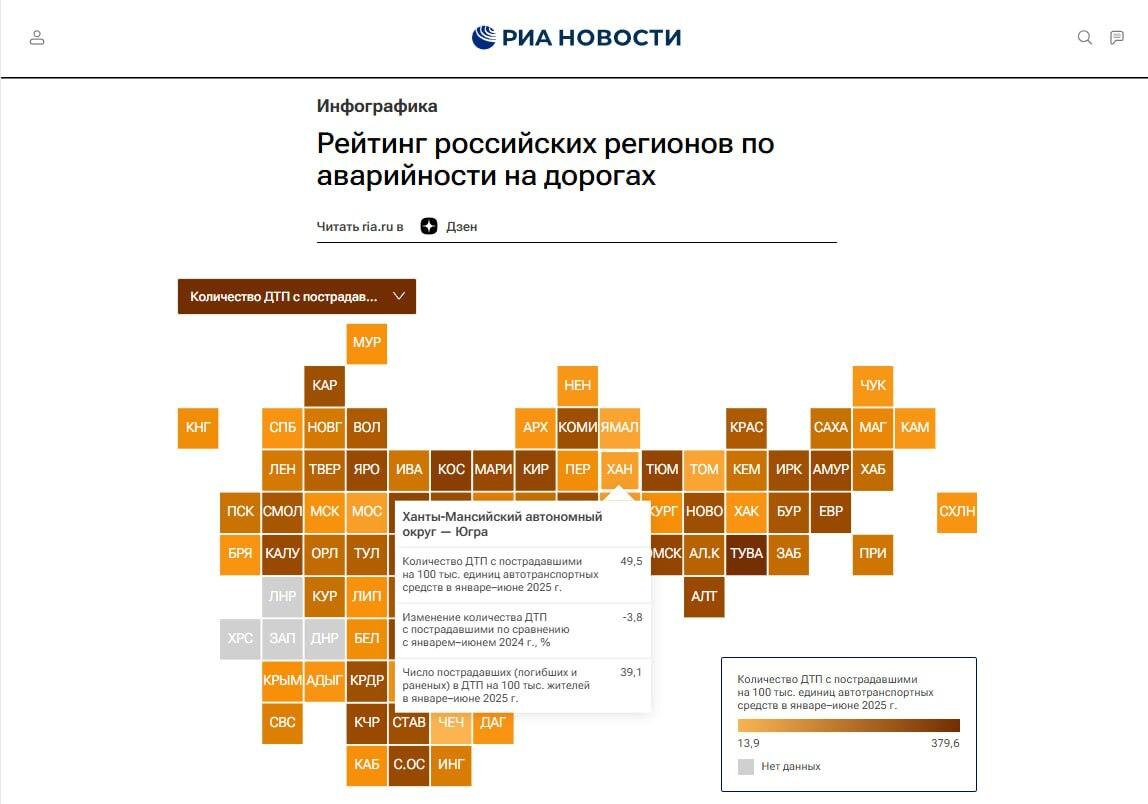 Югра — в топ-10 регионов с минимальной аварийностью По итогам первых шести месяцев этого года Югра заняла 6 место среди регионов страны с самой низкой аварийностью на дорогах, поднявшись на одну строчку по сравнению с аналогичным периодом прошлого года, сообщает РИА Рейтинг. 👍 Показатель аварийности в Югре составил 49,5 ДТП с пострадавшими на 100 тысяч автомобилей. Это на 3,8% меньше, чем в январе–июне 2024 года. Число пострадавших снизилось до 39,1 человека на 100 тысяч жителей региона. В прошлом году Югра занимала 7 место: 53,9 ДТП и 43,3 пострадавших. 🛣️ Повышению безопасности на дорогах способствует не только развитие инфраструктуры, но и профилактика нарушений. Госавтоинспекция Югры напоминает водителям об опасности выезда на полосу встречного движения, это часто становится причиной лобовых столкновений с тяжёлыми последствиями. За 7 месяцев 2025 года в округе произошло 39 таких аварий, в которых погибли 15 человек и 72 получили ранения. Первая «тройка» рейтинга: 🏆 Лид