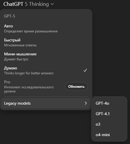 Теперь платным пользователям доступны o3, o4-mini, GPT-4o и 4.1. GPT-4.5 доступна только для Pro-подписчиков. Чтобы появились старые модели, нужно включить Legacy models в настройках.