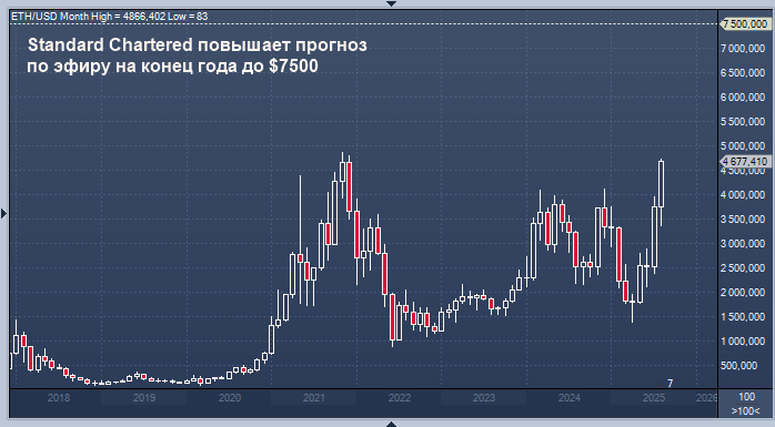 Эксперты уже давно прогнозировали, что эфир может превзойти биткоин. И вот теперь эти прогнозы начинают сбываться. График эфира интервалами в 1 неделю В среду Standard Chartered пересмотрела свой прогноз по эфиру на конец года. Теперь он составляет 7500 долларов, что на 3500 долларов больше, чем ожидалось ранее. Причиной пересмотра прогноза стало улучшение взаимодействия с индустрией и рост запасов криптовалюты в последние месяцы. Эфир стал предпочтительным токеном для тех, кто ищет более активный доход. В отличие от биткоина, который зависит исключительно от роста цены, эфир можно использовать для стейкинга — практики, когда держатели блокируют свои токены для поддержки сети Ethereum в обмен на вознаграждение. За последние четыре недели курс эфира вырос более чем на 50%, чему способствовало принятие закона «Genius Act» — закона, регулирующего криптовалюты, привязанные к доллару, известные как стейблкоины. Цены на другие криптоактивы также выросли в надежде на то, что закон приведёт к