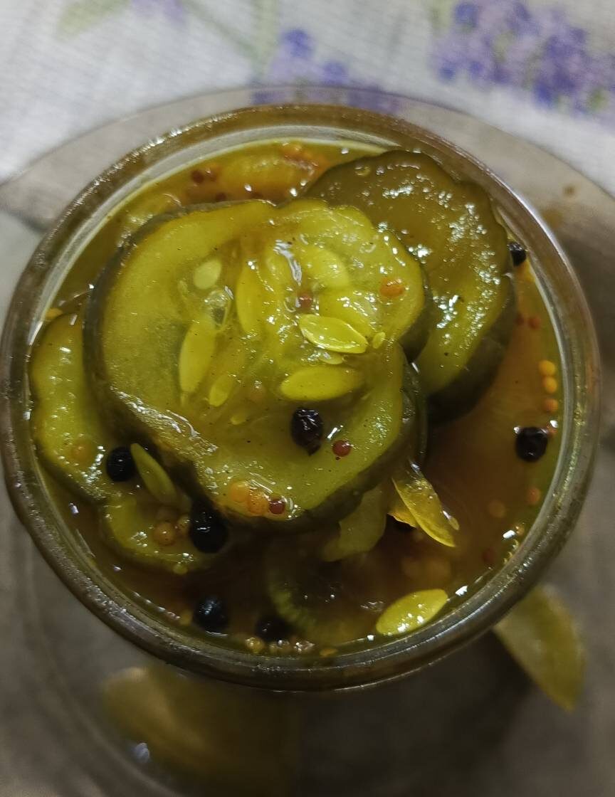 Если у Вас уродился урожай слишком "большой" или как говорят НЕЛИКВИД, такой как у меня, то готовьте эти вкусные огурчики на зиму побыстрей. • огурцы — 3 кг • репчатый лук — 8 шт. • соль — 9 ст.ложек • яблочный уксус — 4 стакана • сахар — 4 стакана • семена горчицы — 4 ст.ложки • куркума — 1 ст.ложка • чёрный перец горошек — 2 ст.ложки • чёрный душистый перец — 1 ст.ложка Берем огурцы, большие тоже приветствуются! Режим их не тонко, толщиной около 0,5 см, я люблю немного потолще. В ту же ёмкость, где огурцы, нарезаем лук, кольцами либо полукольцами, как больше нравится именно ВАМ. Добавляем соль, и обязательно перемешиваем, оставляем часа на 2. Сверху можно поставить груз. У меня кувшин для воды :) Спустя 1-2 часа, сок от огурцов сливаем, он нам не нужен. Огурцы промываем под краном и отжимаем. Варим рассол. В кастрюлю вливаем уксус, туда же сахар, зёрна горчицы, куркуму и перец. Ставим все на огонь. Когда уксус закипит и сахар весь растворится, закладываем огурцы с луком и в