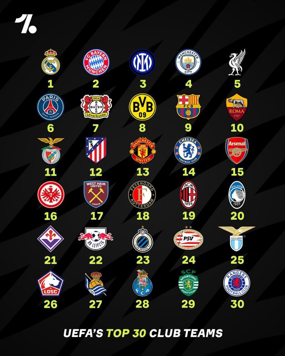Так выглядит 30-ка лучших клубов Европы по последним рейтингам УЕФА