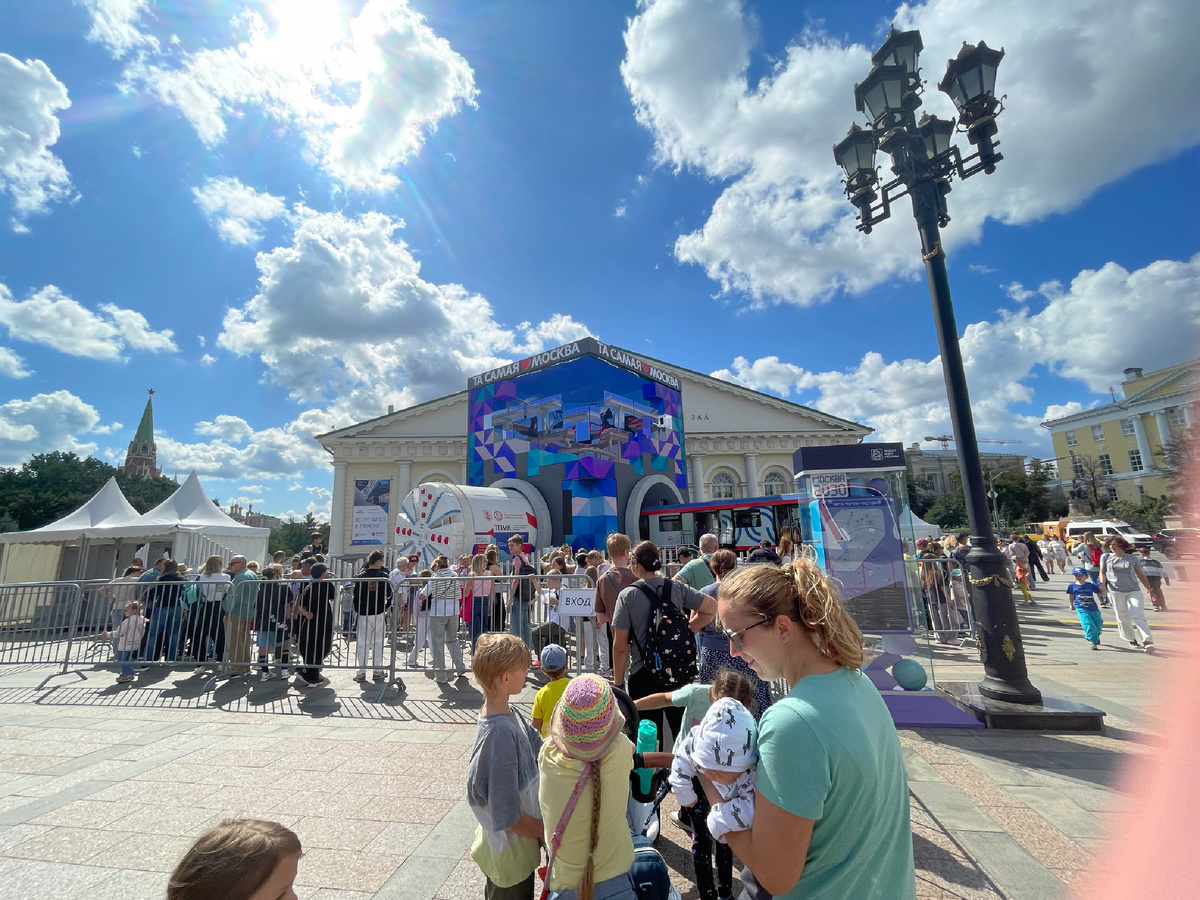 Итак, стоит ли тратить время на эту выставку? Я расскажу свои впечатления, а вы уже решайте сами. Итак, первое, что вас ждет - очереди. На вход мне пришлось ждать целый час на улице. И это в 12 часов в будний день. Что здесь в выходные - страшно даже представить . Но очередь на входе совсем не обеспечит вас отсутствием очередей внутри. Это, например, вход на детскую площадку. Примерное время ожидания более часа В любой абсолютно аттракцион - очередь. Из-за очередей красоту на стенах тоже рассмотреть сложно. А она там интерактивная и интересная. Это самая короткая очередь - 15 минут. Дежурные на входе сказали, что мне просто повезло. Обычна она более часа ожидания. В некоторые локации я так и не попала: невозможно осилить все очереди за один день Вокзал прошлого и будущего. На вход в локации мне не хватило терпения попасть, любовалась интерактивными стенами. На них шли видео презентации из прошлого и будущего вокзала:) Иногда можно даже было рассматривать не через головы людей:) Пот