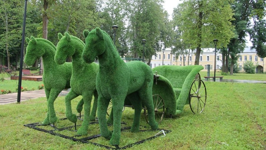 В городском саду Вышнего Волочка установили удалую тройку, запряженную в карету. Впечатляющая конструкция на металлическом каркасе покрыта искусственным зеленым материалом, который имитирует траву. К слову, детали композиции проработаны с высокой точностью. Лошади будто с нетерпением ждут, когда смогут продолжить путь по Государевой дороге. В XVIII веке этот тракт проходил вдоль Цнинского канала. Новый арт-объект напомнит о важности этого исторического места. В Петровском сквере рядом с вокзалом установили еще одну топиарную фигуру в форме сердца, вершину которого украшает надпись "Вышневолоцкий муниципальный округ". У жителей и гостей города появилось новое место для прекрасных фотографий. Ранее на ТИА: В Ржеве восстановили поврежденные вандалами скульптуры коней