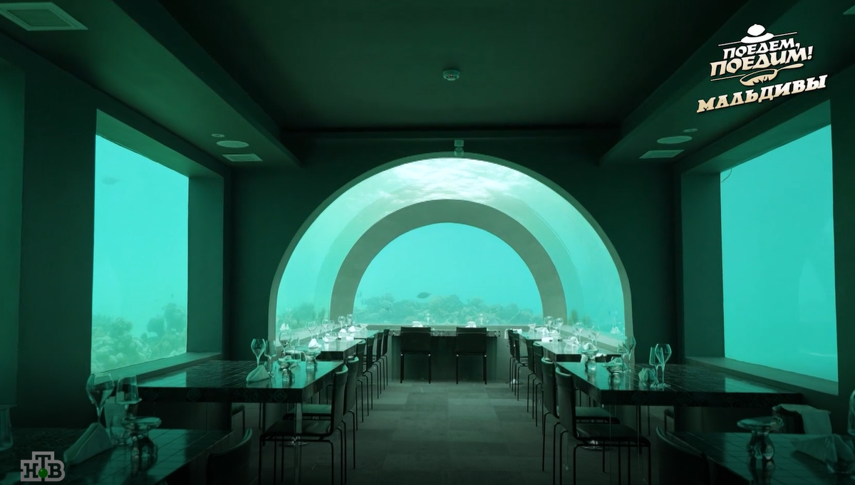 Обед на глубине 6 метров: в одном из мальдивских ресторанов можно насладиться блюдами высокой кухни, наблюдая при этом за акулами и другими морскими обитателями.