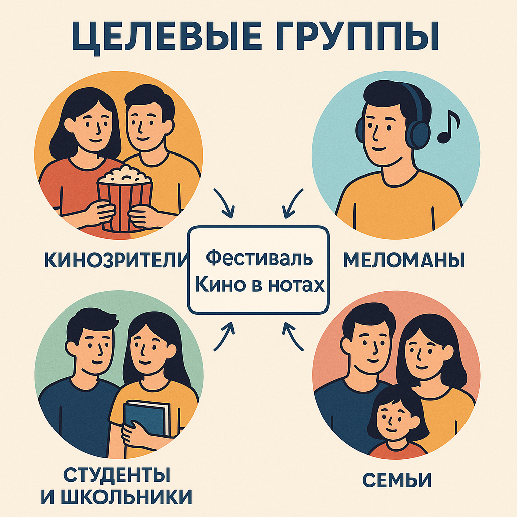 Наши целевые группы: - Учащиеся средних и высших учебных заведений 12-27 лет - Волонтеры, активисты молодежных движений 16-35 лет - Люди с ОВЗ - Широкая общественность, включая семейные аудитории, молодежь и старшее поколение - Профессионалы из индустрии кино и музыки, включая режиссеров, композиторов, продюсеров, а также студенты творческих специальностей - Любители музыки и кино, ценящие оригинальные саундтреки и музыкальные интерпретации в кино искусстве. Мероприятие реализуется при поддержке Президентского фонда культурных инициатив.