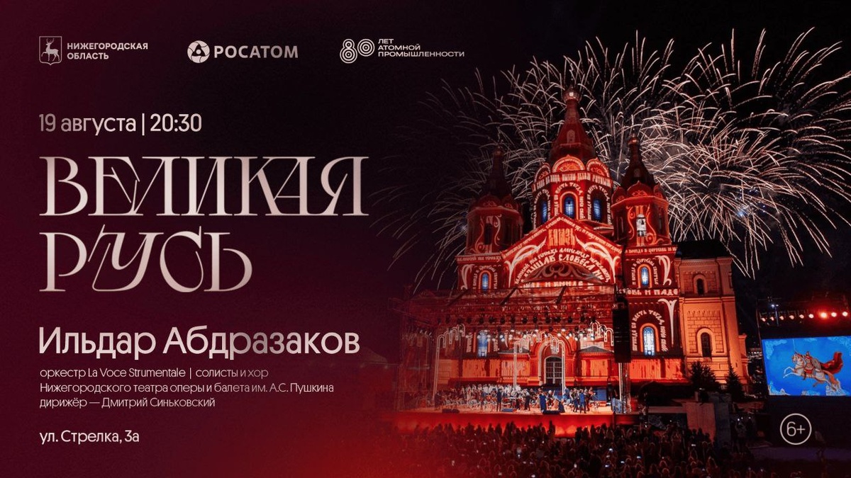 ‼️Открылись продажи билетов на музыкальный фестиваль у собора Александра Невского «Великая Русь»‼️ Подробнее о событии Музыкальный фестиваль «Великая Русь» в этом году станет масштабным художественным посвящением героическим и судьбоносным моментам в истории нашей страны. Концерт будет разделён на четыре части: от Древней Руси — времён варягов, гуннов, половцев и татаро-монгольского ига — до эпохи Смуты и нижегородского ополчения, затем к подвигу советского народа в Великой Отечественной войне и, наконец, к периоду оттепели и научно-культурного подъёма. Это не просто концерт — это глубокое музыкально-историческое путешествие, в котором оживает судьба России. Концерт приурочен к празднованию 80-летия атомной промышленности. В программе прозвучат вокальные и оркестровые произведения в исполнении выдающегося российского оперного певца Ильдара Абдразакова, оркестра La Voce Strumentale и хора Нижегородского театра оперы и балета им. А. С. Пушкина. За дирижёрским пультом — маэстро Дмитри