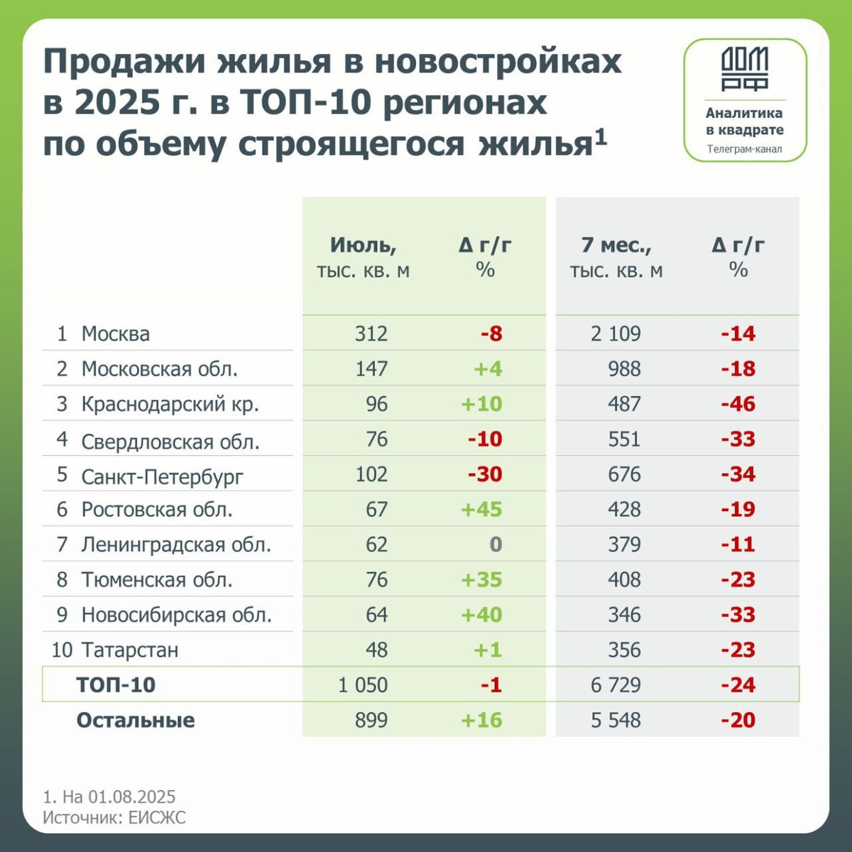 ⚠️📣 Продажи новостроек в Питере летят вниз Мне некоторые пишут, что я говорю неправду о ситуации на рынке новостроек Петербурга. Вот данные от ДОМ,рф июль 2025 в Петербурге стал на 30% хуже по продажам, чем хреновый июль 2024-го, а за 7 месяцев падение составило 34%. Думаю, что застройщики Петербурга могут и дальше поднимать цены, пока продажи не встанут совсем.