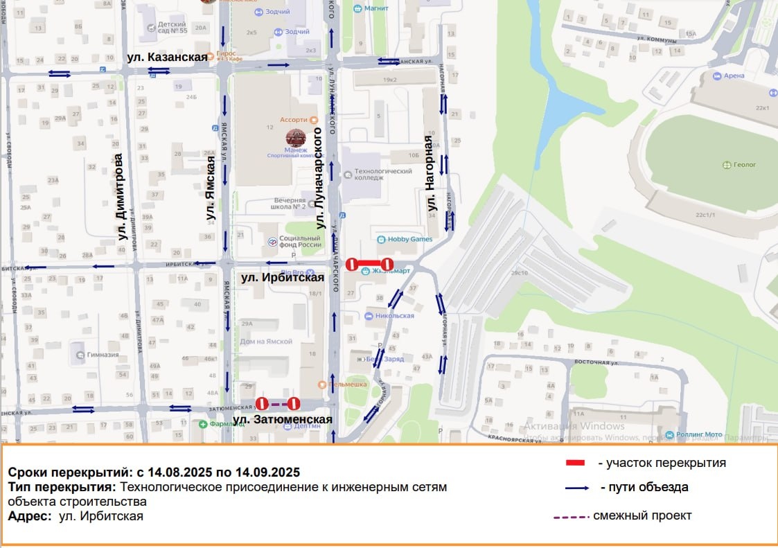 Вниманию автомобилистов! В связи с выполнением работ по технологическому присоединению объекта строительства к инженерным сетям в период с 14.08.2025 по 14.09.2025 планируется прекращение движения транспорта по автомобильной дороге ул. Ирбитской от ул. Луначарского до ул. Нагорной. Участников дорожного движения просим обращать внимание на знаки, заранее планировать маршрут, соблюдать Правила дорожного движения РФ. Возможные пути объезда: ул. Нагорная, ул. Луначарского, ул. Казанская. Департамент дорожной инфраструктуры и транспорта