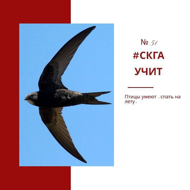 Птицы умеют «спать на лету» #СКГА_учит Альбатросы и стрижи могут спать, дрейфуя на воздушных потоках, при этом одна половина мозга остается активной. Это позволяет им отдыхать во время длительных перелетов над океаном. Знали про данный факт? ❤️ – да 🔥– еще больше фактов