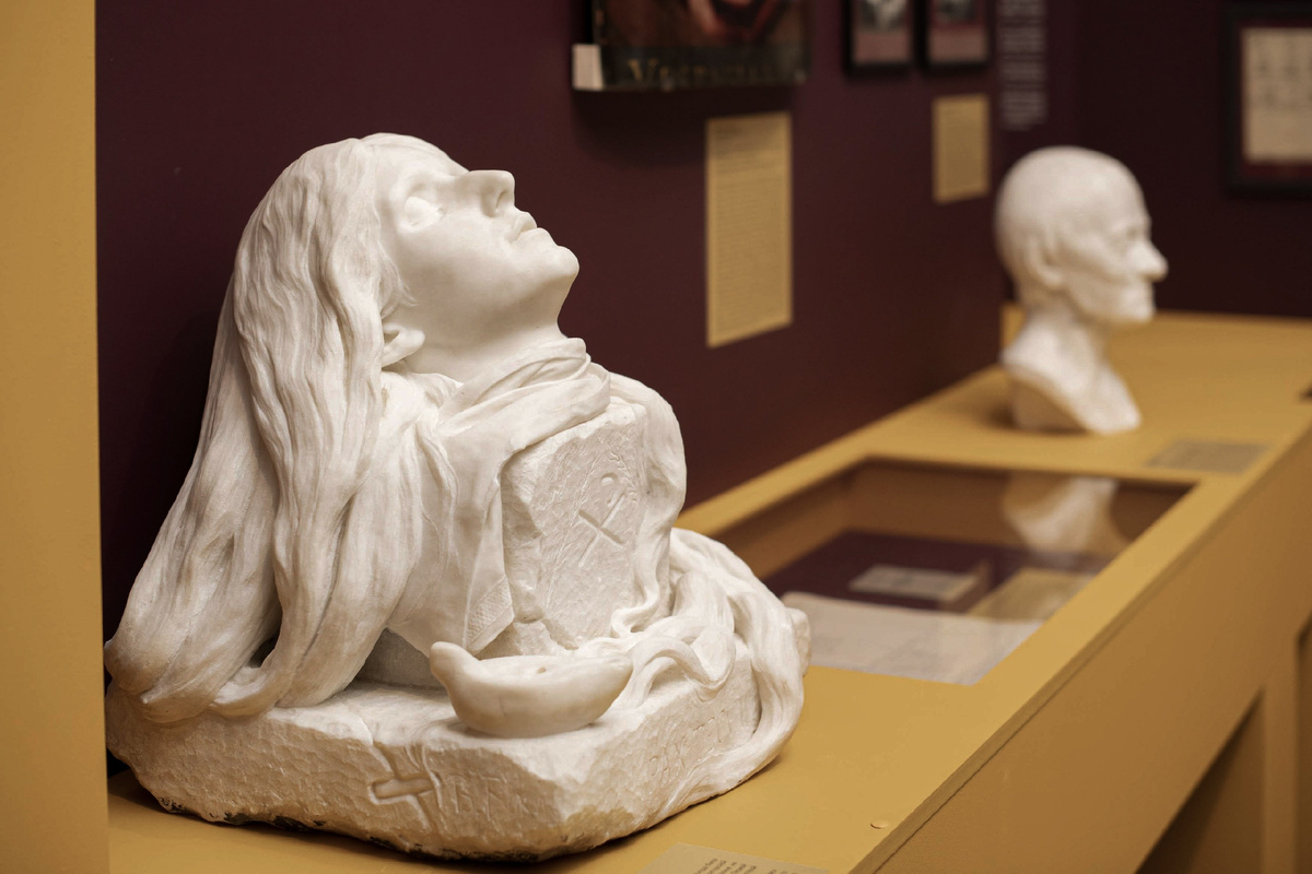 Скульптуру В.А. Беклемишева «Pax tecum» (1894 г.) музей приобрел как раз в 1930-м. Выразительная мраморная голова христианской мученицы подписана латинской фразой, которая означает «мир с тобой» и встречается в ранних христианских катакомбах. На протяжении столетий выражение «Pax tecum» служит формой приветствия или прощания – пожеланием спокойствия и благоденствия тому, к