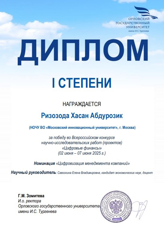 Наш выпускник #МосковскийИнновационныйУниверситет Ризозода Хасан Абдурозик награжден дипломом 1 степени за победу во Всероссийском конкурсе научно – исследовательских работ(проектов) «ЦИФРОВЫЕ ФИНАНСЫ», в номинации «Цифровизация менеджмента компаний» под научным руководством кандидата экономических наук, доцента кафедры экономики, менеджмента и информационных технологий Савоскиной Елена Владимировны. 💫 Поздравляем Хасана и желаем ему огромных успехов в профессиональной деятельности!!! А мы ждем наших новых абитуриентов!!! ‼ До начала учебного года осталось совсем немного. ❓Есть вопросы? Сотрудники приемной комиссии ответят на каждый из них Тел. +7 (495) 953-11-65 Тел. бесплатный: 8 (800) 250-10-91 Электронная почта: moscow.priem@mail.ru 🔗 Подробнее о нас на нашем официальном сайте 📱 ТГ - канал - задать вопрос 📱 ВКонтакте 📱 Дзен #ПоступаювМИУ #высшееобразование #МосковскийИнновационныйУниверситет