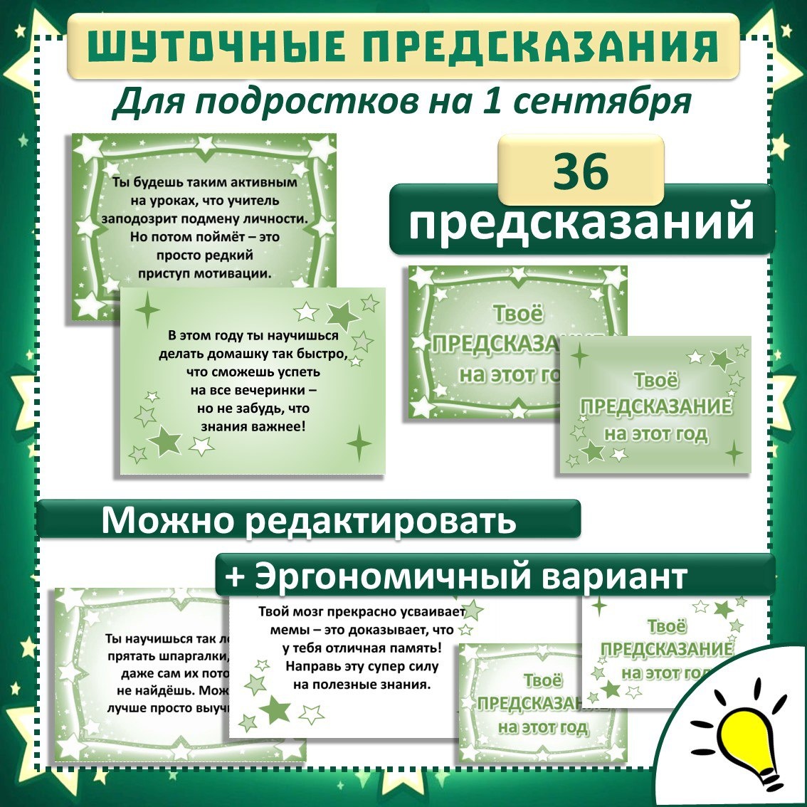 🔮 Шуточные предсказания на 1 сентября для старшеклассников Дорогие коллеги! 😊 Хотите начать учебный год с улыбки? Эти весёлые предсказания помогут разрядить обстановку и настроить подростков на позитив! Что в комплекте? ✅ 36 предсказаний с подростковым юмором: «Твой мозг прекрасно усваивает мемы – это доказывает, что у тебя отличная память! Направь эту супер силу на полезные знания». «Ты наконец-то поймёшь, что «не знаю» – это не ответ на вопрос учителя. Но «я подумаю» – уже прогресс!» ✅ 3 стильных дизайна на выбор (звёзды, минимализм, волшебные рамки) ✅ 2 формата: PDF – готов к печати (4 листа А4) PPTX – можно добавить свои шутки Как использовать? • Раздать на классном часе • Устроить «лотерею предсказаний» • Положить в дневник как сюрприз 📥 Скачать или ознакомиться подробнее https://vk.cc/cOjQWW #1Сентября #Подростки #ШкольныйЮмор Лёгкий способ создать доверительную атмосферу с первых дней!