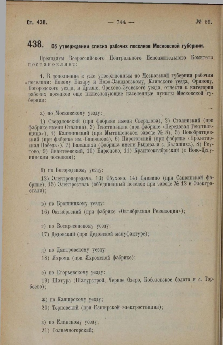 Постановление Всероссийского Центрального Исполнительного Комитета. Об утверждении списка рабочих поселков Московской губернии. 21 мая 1928 г.