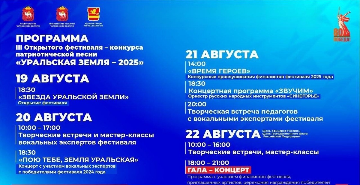 С 19 по 22 августа в Златоусте (Челябинская область) пройдёт III Открытый фестиваль-конкурс патриотической песни «Уральская земля» (12+). Мероприятие, посвящённое героям нашего времени – защитникам Родины, труженикам тыла, педагогам и всем, кто вносит вклад в развитие страны, соберет талантливую молодежь со всего Урала. Как сообщили сегодня, 13 августа, в пресс-службе министерства культуры региона, в этом году в конкурсе участвуют 26 финалистов из Челябинской, Свердловской, Курганской, Оренбургской областей, Ханты-Мансийского автономного округа и Башкортостана. Возраст участников – от 14 до 35 лет. Они выступят в трёх номинациях: солисты, ансамбли и хоры. Фестиваль откроется 19 августа концертом с участием победителей прошлого года и хедлайнера – эстрадного певца Алексея Ковина, лауреата премии «Золотая Лира» и участника телепроектов Первого канала. В последующие дни гостей ждут мастер-классы, творческие встречи и выступления вокальных экспертов. 21 августа состоится конкурсный день, г