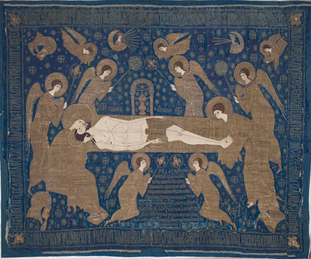 В фондах Новгородского музея-заповедника хранится настоящее сокровище — плащаница «Положение во гроб», выполненная в технике шитья золотными, серебряными и шелковыми нитями по синей камке. Плащаница – четырехугольный плат с живописным или вышитым изображением снятого со Креста тела Христа Спасителя. В конце вечерни Великой Пятницы плащаница выносится на середину храма для поклонения верующих и остается там до пасхальной полунощницы, на которой снова уносится в алтарь. В 1456 году князь Василий Темный вложил рассматриваемую плащаницу в Новгородский Софийский собор. Долгое время она считалась местным памятником, однако по своим иконографическим и художественным особенностям она сближается с целой группой московских произведений того же периода и скорее всего была создана в великокняжеской мастерской. Около гроба Христа изображены Богоматерь, Иоанн Богослов и четыре ангела. В углах — символы евангелистов, в верхней части композиции — персонификации Солнца и Луны, за местом погребения —