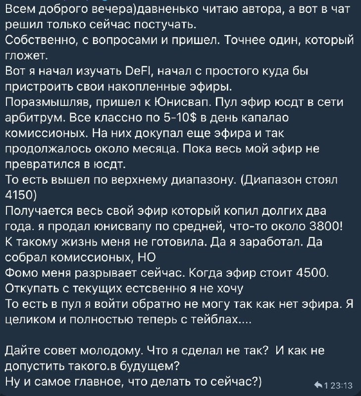 Подписчик задаёт вопрос Что я сделал не так? Перед тем как использовать какой-либо инструмент (или протокол), нужно четко понимать, что и зачем вы делаете. Для начала нам нужно определиться глобально с нашим вью (вИдением). Что глобально мы хотим? Накапливать эфир? Биток? Или мы хотим заработать определенную сумму и забыть про крипту? Вы пишете, что: накапливал эфир последние 2 года Хорошо, стало быть, наша цель — накопление актива. Для реализации поставленной цели вы решили использовать Uniswap. Окей, пока выглядит логично, но с оговорками. Если мы используем инструмент, то значит, мы можем объяснить, как он работает: * Что я буду делать, когда цена выйдет из диапазона по верхней/нижней границе? * На какую доходность я рассчитываю? * Какую аллокацию капитала я готов разместить в этой стратегии? * Буду ли я хеджировать позицию? И сдается мне, что вы не ответили на эти вопросы, а просто воткнули весь капитал в этот инструмент. Цена на эфир выросла, и вот мы здесь: не зна