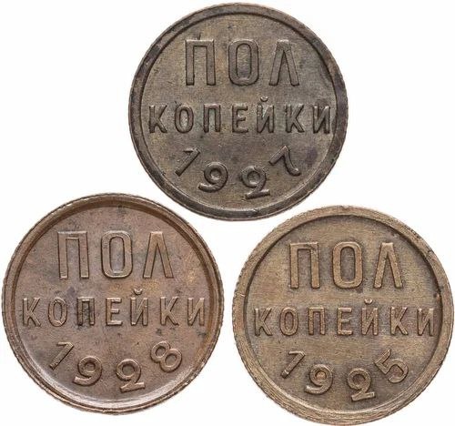 Появление полкопеек 1925–1928 годов связано с расцветом НЭПа (новой экономической политики), когда начался резкий экономический рост и выросла потребность в разменных денежных единицах. В Наркомате Финансов СССР приняли решение о вводе в обращение разменной монеты по царскому образцу. В 1926 году весь монетный ряд из меди заменили аналогичными номиналами из алюминиевой бронзы, но полкопейки в этот год либо не выпускались вовсе, либо дочеканивались штемпелями с датой 1925. В 1927 году производство полукопеек возобновили, но тираж вышел немного меньшим. К 1928 году эпоха НЭПа начала клониться к своему закату, свободное предпринимательство всё больше запрещалось, наступала эпоха военного коммунизма и плановой экономики. Повысилась инфляция и рост цен, поэтому потребность в таком номинале, как полкопейки, пропала. После прекращения чеканки монеты номиналом полкопейки из оборота не изымались. Несмотря на то, что в обращении они использовались мало, фактически их можно было встретить в оборо