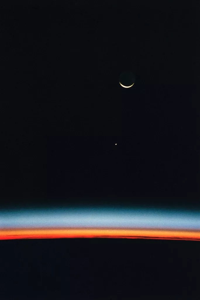 Великолепная фотография Луны и Юпитера над горизонтом Земли, сделанная с борта космического корабля «Индевор» 🌒