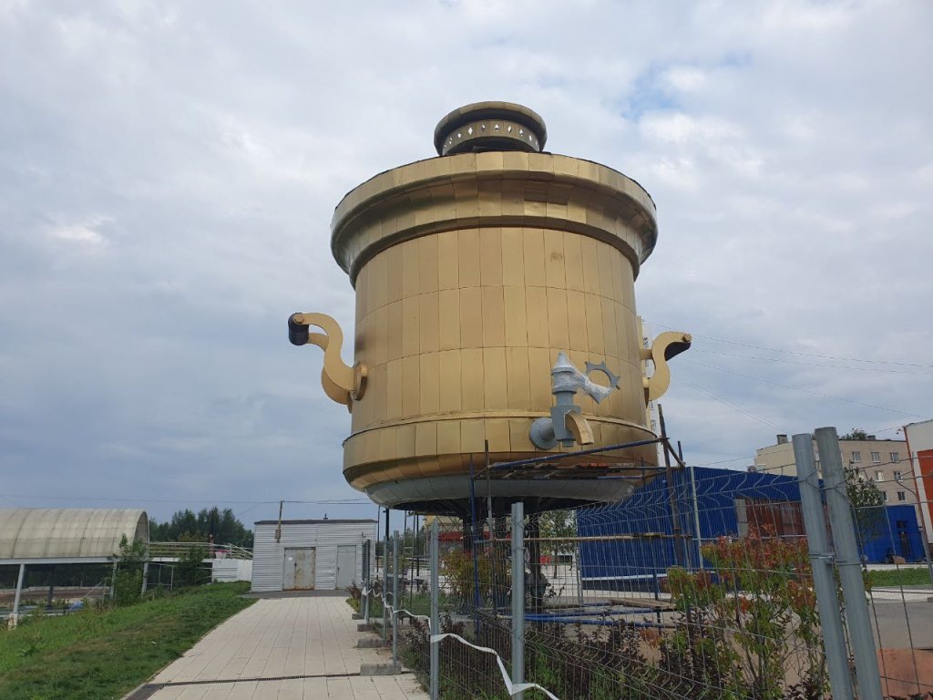Гигантский «золотой» самовар установили около канатной дороги на Бору. Как выяснил корреспондент GIPERNN.RU, арт-объект уже несколько недель собирают на парковке рядом с переправой. Масштабная фигура напоминает настоящий самовар — с ручками, краном и конфоркой. Его нижнюю часть пока не установили. Сборка арт-объекта продолжается: территория на парковке огорожена забором, за которым стоят бытовки. Как объяснил «Борскому информационному агентству» глава округа Алексей Боровский, самовар не просто станет фотозоной, но и получит практическую функцию. Это место стилизуют под Музей самоваров. Планируется, что ко Дню города [отмечался 10 августа — прим. ред.]Бор получит такой интересный подарок. Возможно, он будет выглядеть несколько смело. Это крупное архитектурное решение, но подобные объекты в традициях русской культуры хорошо вписываются в инфраструктуру города. Думаю, этот объект станет еще одной точкой притяжения Бора, — рассказал Алексей Боровский. Поблизости разместится павильон с мас