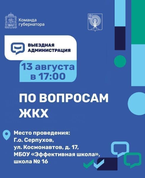 По обращениям жителей проведут выездную администрацию по вопросам ЖКХ Жители микрорайона Чернышевского смогут задать вопросы по ЖКХ чиновникам Серпухова. Обсудить работу управляющих организаций, планы по модернизации системы жилищно — коммунального хозяйства пригласили жителей на встрече с главой округа. 📆Дата:13 августа, в 17:00. 📍Место: школа №16.