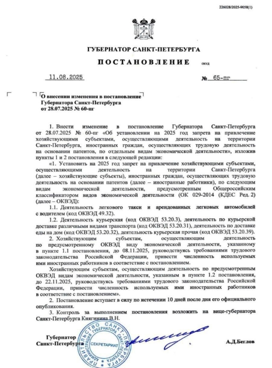 11 августа 2025 года Беглов А. Д. подписал указ запрещающий иностранцам работать курьерами в городе. На адаптацию к новым правилам дали 3 месяца, т. е. до 11 ноября мигрантов должны уволить из службы доставки. Эта мера была принята для ограничения трудовой миграции. Согласно оценкам экспертов введение ограничений на работу мигрантов в курьерской сфере приведёт к: Давайте рассуждать... Раз стала писать о курьерах, расскажу случай, который произошёл буквально дня три назад в нашем ЖК. В нашем ЖК дворы без машин. Поэтому курьеры оставляют свои машины так же, как и жители на большой парковке и потом идут пешочком внутри квартала. Гуляли мы с ребёнком в одном из дворов. И вдруг слышу жуткий мат. Идёт курьер, в руках 4 пакета, видно, что продукты, на каждом пакете прилеплен листочек. Курьер по виду иностранец, но матерился на русском. Курьер подбежал к двери одной парадной, оказалась не та. Он направился к другой, один из пакетов у него упал, он его пнул ногой, ещё раз выругался. В - эт