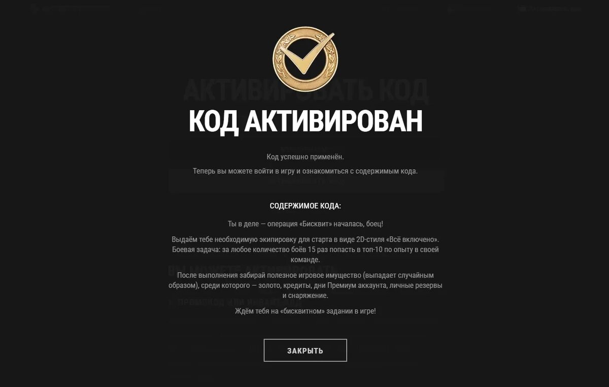 Бонус-код: WSM25TM15MT Содержимое: Задача "Операция «Бисквит»": Список возможных наград: https://wotexpress.info/news/mir-tankov/spisok-vozmozhnykh-nagrad-iz-operatsii-biskvit-v-mire-tankov/ Активируем бонус-код тут: https://lesta.ru/shop/redeem/?bonus_mode=WSM25TM15MT
