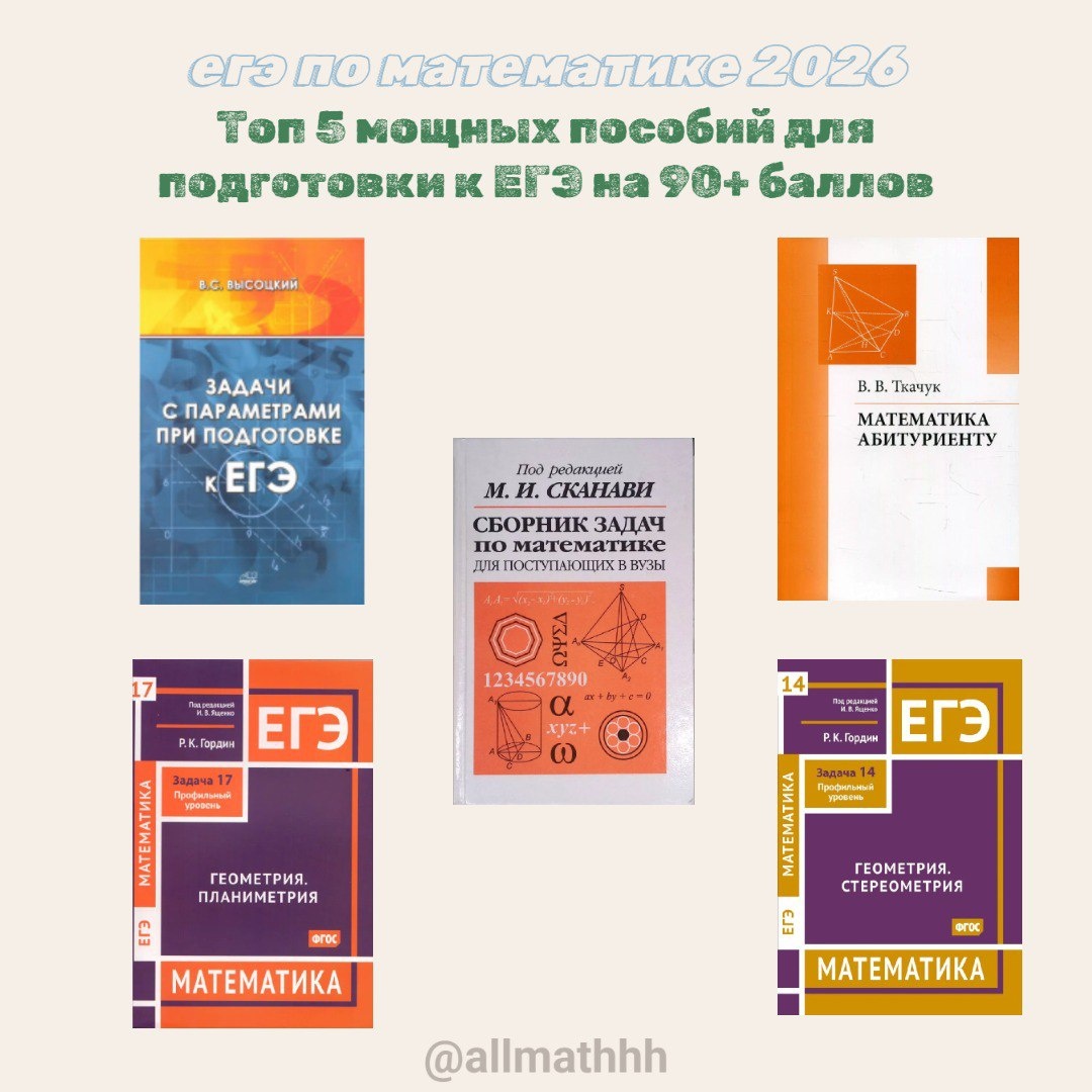 Топ-5 мощных пособий для подготовки к ЕГЭ на 90+ баллов Подборка лично от меня для амбициозных старшеклассников 🤍 Можно использовать, если готовитесь самостоятельно, а также дополнительно к занятиям с репетитором / в ОШ Полный охват школьной математики, уникальные алгоритмы самоподготовки. Чёткая структура: теория → примеры → задания от базового до олимпиадного уровня. Очень ценен для глубокого повторения и систематизации знаний. Узконаправленное пособие, посвящённое параметрам — одной из самых сложных тем профильного ЕГЭ. Детальная проработка тематики помогает избавиться от ошибок «в узких местах» при решении нестандартных задач. Классический задачник для углублённой отработки. Рекомендуется для повышения уровня трудности и развития математического мышления. Тематические пособия для отработки заданий № 14 и № 17. Задачи расположены по уровню сложности, встречаются и олимпиадные подходы. Полезны для формирования устойчивых навыков в геометрии, необходимой для части 2 и Д