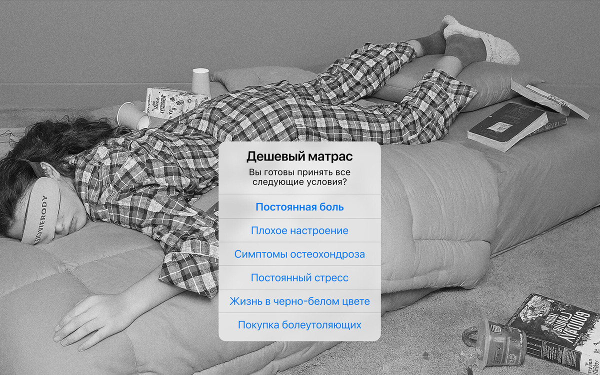 Несколько лет назад я жила в съёмной квартире. Самая обычная, с бело-желтыми потертыми стенами и шкафом, который открывался только с третьего пинка. Матрас там тоже был, не сильно старый, но уже уставший от жизни. Он проваливался посередине, скрипел при каждом движении, а пружины упирались в рёбра. Лежать на нём было некомфортно, но я, как типичный миллениал — терпела и спала. Каждый день.