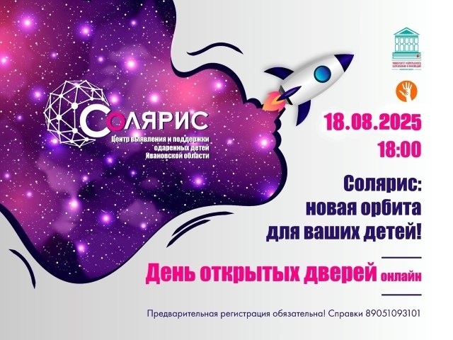 🎓 «Солярис» приглашает ивановцев на день открытых дверей в онлайн-формате 18 августа ивановский «Солярис» проведет День открытых дверей. Формат — онлайн. Не выходя из дома, жители разных уголков Ивановской области узнают о наборе 2025 года: как стать участников образовательных программ, как проходят занятия, как поучаствовать иногородним. Начало в 18:00. Зарегистрироваться и задать интересующие вас вопросы можно уже сейчас.