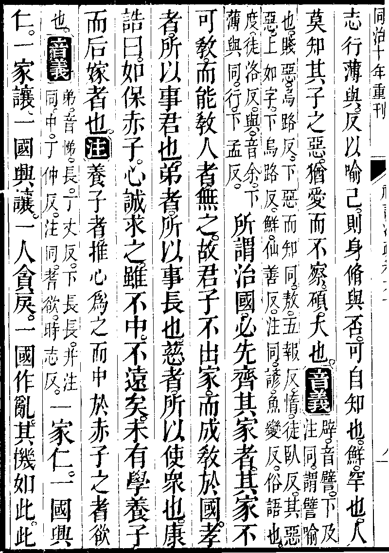 所謂治國必先齊其家者,其家不可教而能教人者,無之。故君子不出家而成教於國:孝者,所以事君也;弟者,所以事長也;慈者,所以使眾也。