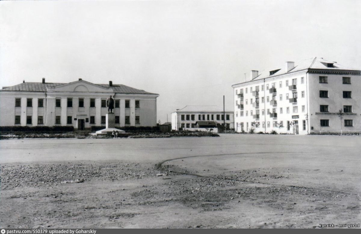 Катайск. Центральная площадь Описание: Райком КПСС и дом Ленина,208. В проеме между ними - здание КБО (комбината бытового обслуживания населения). За забором деревянное здание - шерстобитка. Впоследствии на месте этой избушки будут построены гаражи для автотранспорта комбината. Из фондов музея КНЗ. 1965, Россия, Курганская область, Катайский район https://vk.cc/cOxE3s