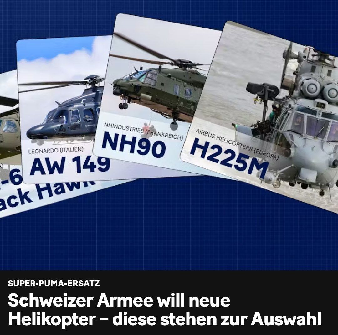 📌 " Швейцарские вооруженные силы планируют заменить свои старые вертолеты Super Puma и Cougar. На замену выделено 1,5 миллиарда франков, которые финансируются из годового армейского бюджета. На выбор предлагаются такие модели, как Airbus H225M, Sikorsky UH-60 Black Hawk и Leonardo AW149. Новый вертолет должен быть универсальным и, возможно, лучше защищенным, чем нынешние модели. Закупки вертолетов всегда проходили гораздо более гладко, чем закупки самолетов - эксперт. "В последние несколько раз они укладывались в бюджет и сроки: Потребность в вертолетах обычно менее политически противоречива, чем в истребителях - хотя и здесь речь идет о больших деньгах".