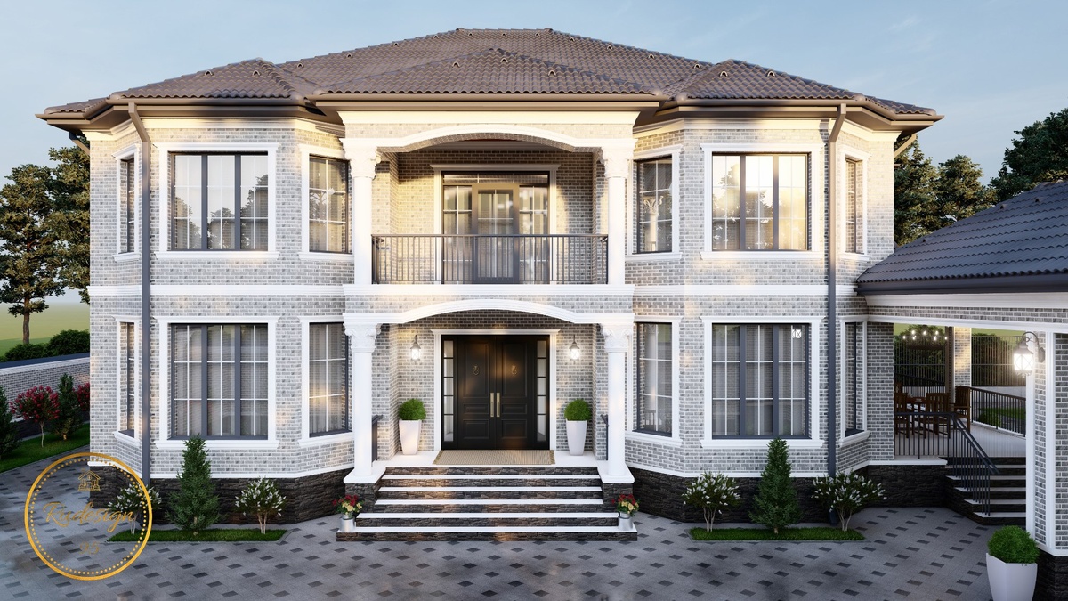 Проект двухэтажного жилого дома с открытым навесом и террасой на 460 кв.м. Первый этаж: кухня, две гардеробные, холл, спальня, гостевая комната, ванная, варочная, столова, гостиная, тех.помещение; Второй этаж: три спальни, гардеробная, ванная, холл, постирочная, кабинет, балкон.
