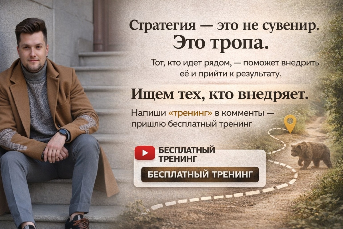: — Почему решили работать со мной? Он усмехнулся и положил на стол две толстые папки: — Антон, вот наши прошлые стратегии. Красивые, по 40 страниц каждая. Диаграммы, схемы, планы. Мы их даже распечатали на хорошей бумаге. — И что? — И ничего. Они у нас лежат в шкафу. Никто так и не открыл. --- Я видел это десятки раз. Когда консультант делает всё, кроме главного — не идёт с клиентом дальше. Показать путь — да. Объяснить шаги — да. Но этого мало. --- Стратегия — это не сувенир. Это тропа. На старте кажется: «Пойдём по ней и дойдём». Но стоит сделать пару шагов — и кто-то уже сворачивает «по ягоды», кто-то задерживается у кустов иван-чая, а впереди вдруг выходит медведь — кассовый разрыв. --- Тогда и нужен тот, кто идёт рядом: — подскажет, где обойти завал, — вернёт на маршрут, если ушли не туда, — поможет пройти мимо «соблазнов» и дойти до точки Б. --- Потому что на полках стоят сотни мёртвых стратегий. А в деле остаются только те