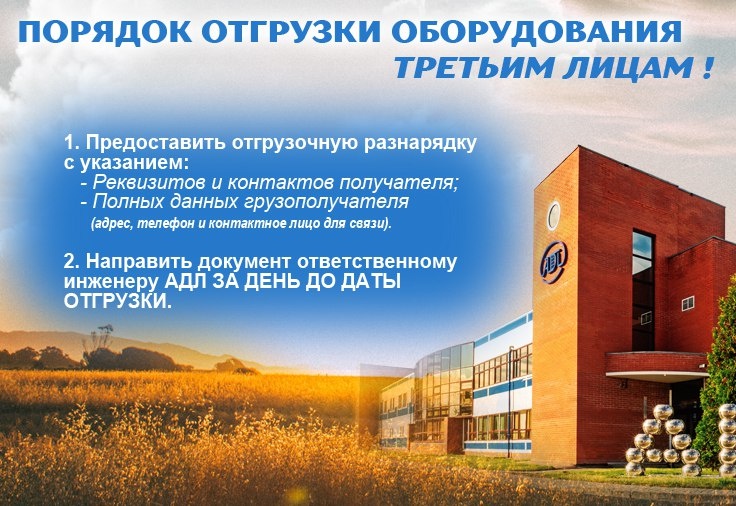 Важно: порядок отгрузки оборудования третьим лицам ! Уважаемые клиенты! Чтобы обеспечить беспрепятственную отгрузку вашего оборудования, напоминаем об обязательном требовании: Если оборудование отгружается не вам, а третьему лицу (застройщику, монтажной организации, грузоперевозчику и т.д.), необходимо заранее уведомить нас об этом! Что нужно сделать? 1. Предоставить отгрузочную разнарядку с указанием: - Реквизитов и контактов получателя; - Полных данных грузополучателя (адрес, телефон и контактное лицо для связи при доставке). 2. Направить документ ответственному инженеру АДЛ ЗА ДЕНЬ ДО ДАТЫ ОТГРУЗКИ. Без этой информации отгрузка оборудования будет приостановлена. Это требование гарантирует: 1. Безопасную и своевременную передачу груза; 2. Корректное оформление документов; 3. Отсутствие задержек у вашего клиента. Спасибо за понимание!