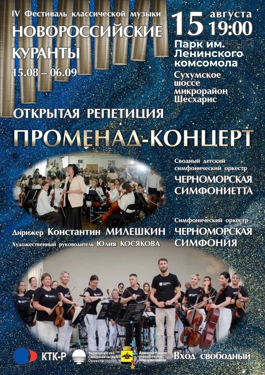 🎶 Это будет музыкальное событие лета в Новороссийске! 15 августа мы вместе откроем VI концертный сезон Черноморской симфонии и дадим старт IV фестивалю «Новороссийские куранты» при благотворительной поддержке Каспийского Трубопроводного Консорциума (АО "КТК-Р")! 📍 Парк им. Ленинского комсомола — 19:00 (открытая репетиция в формате PROMENADE-КОНЦЕРТА) 🎼 В парке вас ждёт музыкальный сюрприз от B.rave! 💎 Это не просто концерт. Это – праздник музыки, города и людей! Вас ждёт: 🎻 Шедевры от Моцарта до Пьяццоллы 🎹 Лауреаты и заслуженные артисты Кубани ✨ Живая энергия большого оркестра 💃 Балетные миниатюры и неожиданные музыкальные коллаборации 🎼 В программе: «Аквариум» Сен-Санса и волшебное фортепианное дуо Танго Шнитке и «Одинокий пастух» с флейтой и скрипкой Романтические мелодии из кино, от «Cinema Paradiso» до «Мой ласковый и нежный зверь» И финальный аккорд – «Libertango», который поднимет весь парк на ноги! 🎼 Дирижёр — Константин Милешкин 🎨 Художественный руководитель —