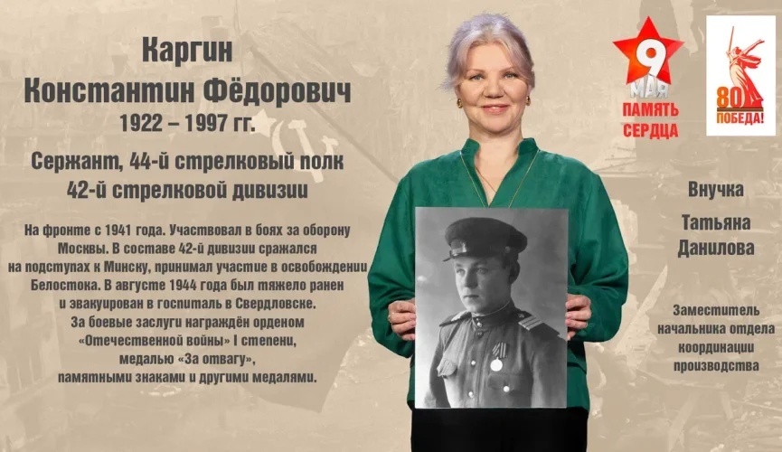 На фронтах Великой Отечественной войны сражался за победу над немецко-фашистскими захватчиками Константин Федорович Каргин — дедушка заместителя начальника отдела координации производства МТРК «Мир» Татьяны Даниловой.
