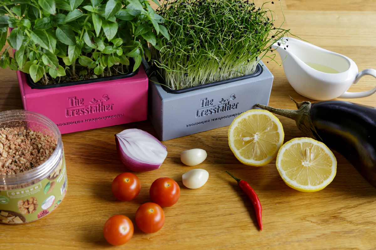 Бабагануш — классическое восточное блюдо. Сочетание запечённого баклажана, свежих овощей и нежной ореховой текстуры идеально подходит к хлебу или лавашу. Шеф Алексей Химандритов из студии Юлии Высоцкой делится пошаговым рецептом! Прошлый рецепт куриных палочек в орехах можно посмотреть по ссылке 🔗 🛒 Ингредиенты • 1 баклажан • ½ лимона (сок) • 5 г чеснока (~1 зубчик) • 3 помидора черри • 30 г красного лука (~1 небольшая луковица) • 20 г ореховой смеси (грецкие, кедровые, миндаль — на выбор) • 20 г оливкового масла • 3 г соли (примерно) • Микрозелень лука-шнитт • Микрозелень базилика ⸻ Пошаговый процесс ✔️ Шаг 1. Подготовка баклажана Нагрейте духовку до 180 °C. Вымойте баклажан, обсушите. Заверните его в фольгу (или просто выложите на противень), запекайте около 40 минут, пока мякоть не станет мягкой и чуть подвяленной. ✔️ Шаг 2. Снятие кожуры После запекания окуните баклажан в холодную воду: это облегчит снятие кожуры. Аккуратно очистите баклажан — кожура должна легко отста