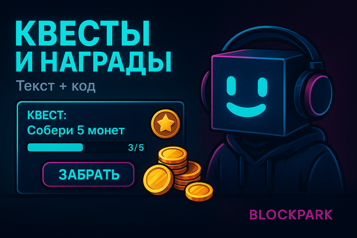Создайте: Если у вас уже есть своя архитектура событий — просто подмените имена в коде. ServerScriptService → Script QuestServer Если у вас её ещё нет, добавьте монетку с ProximityPrompt и при подборе: Workspace → Part Coin → Script StarterGui → ScreenGui QuestsUI → Frame Root (центр, ~420×220)