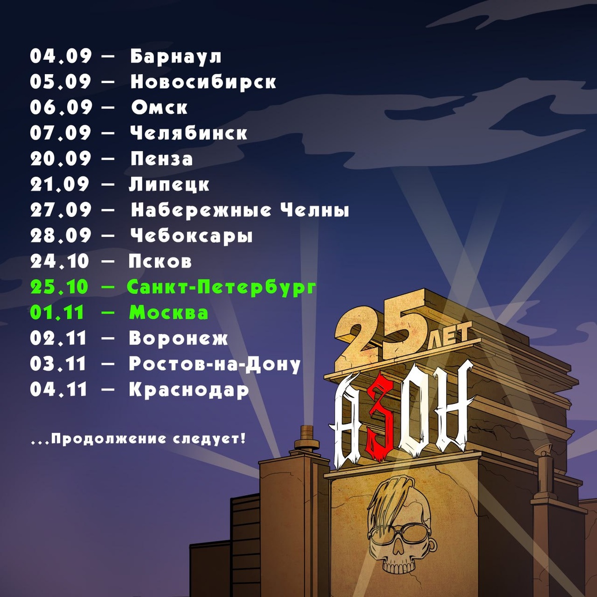 Друзья, напомним, что почти на все концерты тура в наличии билеты на двоих! Их стоимость дешевле, чем покупка двух одинарных билетов и они есть только в предпродаже. На входе их не будет. Да и обычные билеты на входе от 1500, а в предпродаже почти в два раза дешевле, так что, если вы ещё не обилетились, самое время! Все билеты тут: az0n.ru 04.09 — Барнаул 05.09 — Новосибирск 06.09 — Омск 07.09 — Челябинск 20.09 — Пенза 21.09 — Липецк 27.09 — Набережные Челны 28.09 — Чебоксары 24.10 — Псков 25.10 — Санкт-Петербург 01.11 — Москва 02.11 — Воронеж 03.11 — Ростов-на-Дону 04.11 — Краснодар Билеты и подробности: az0n.ru