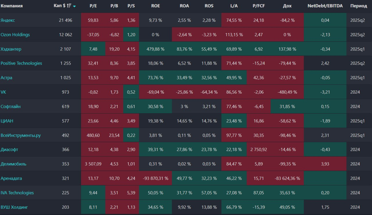 Продолжаю разбор секторов и выбор лучших компаний России из этого опроса. Ранее разобрал нефтегазовый и финансовый сектор. Сегодня продолжаю и разберу IT-компании. Данный пост — это исследование, на которое у меня уходит очень много времени. Репосты этого поста = забота о ваших друзьях, коллегах ☝️🔄 Критерии, по которым я оцениваю компании: 1. Финансовое здоровье — макс. оценка 20. 2. Стоимость по метрикам — макс. оценка 10. 3. Дивиденды (стабильность выплат, их размер, риски сокращения или отмены) — макс. оценка 10. 4. Рентабельность — макс. оценка 10. 5. Выручка, средняя за 5 лет — макс. оценка 10. Кого мы будем рассматривать? Яндекс, ХэдХантер, Ozon, VK Group, Группа Позитив, Софтлайн, Астра, Диасофт, Аренадата, Ива, ЦИАН, Делимобиль, Вуш, ВсеИнструменты.ру. Не все компании из этого списка полностью из IT, но чтобы было интересней сравнивать, то добавлю Делимобиль, Вуш, ВИ.РУ и OZON, так как у всех них большая часть бизнеса связана с IT. Надеюсь на рынке будет все больше IT-компани