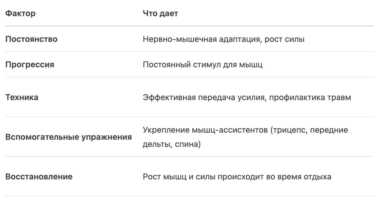 Погоня за весом в ущерб технике — прямой путь к травме (плечевые суставы, грудные мышцы). Ключевые моменты:
