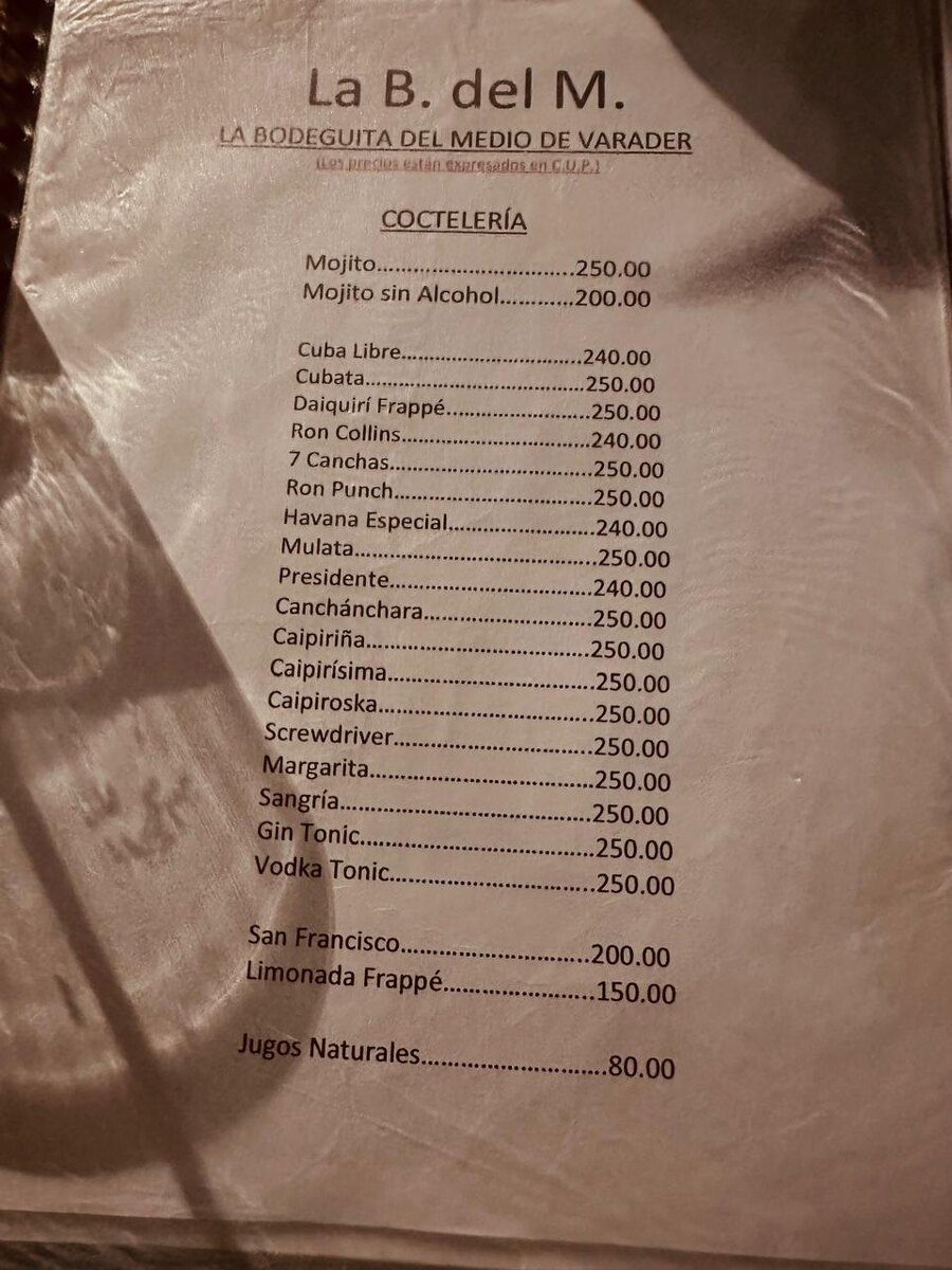 В следующем заведении на входе мы уточнили в чем цены. Нам сказали в долларах. Мы рассмеялись и почти вышли. Но, видимо, опытный администратор догнал нас и сказал, что плохо говорит по-испански 😆 цены в песо, можно платить долларами. Мы вернулись и продолжили заседание по делу жадного официанта из предыдущего заведения.