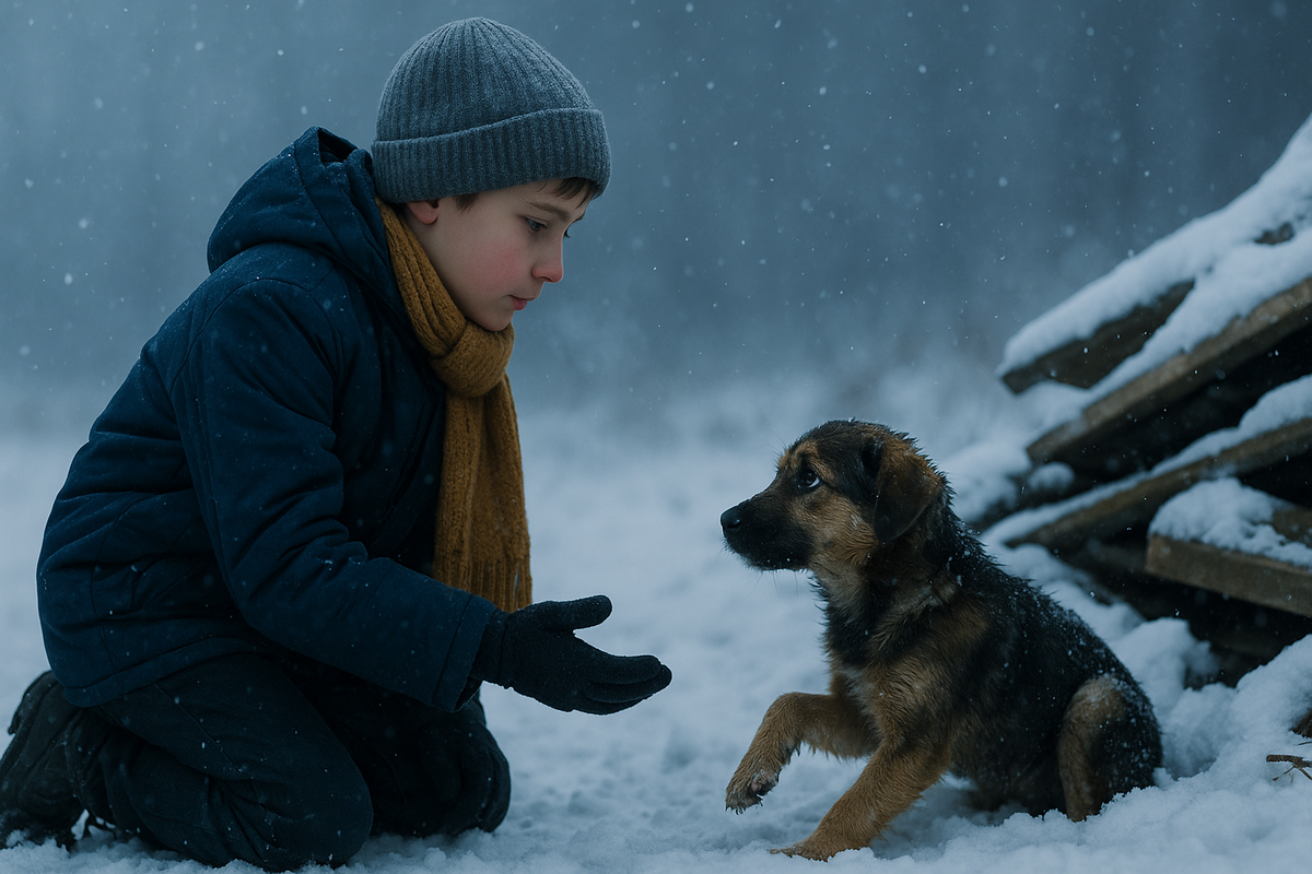Вдруг среди белого безмолвия он заметил слабое, едва различимое движение. Оно было таким крошечным, что кто-то другой мог бы и не заметить. Саша прищурился, сделал пару шагов, и перед ним открылось пронзительное зрелище: у кучи старых досок, наполовину занесённых снегом, лежал щенок. Его шерсть была слипшейся и обледенелой, а маленькая лапка — вывернута под странным углом, от которого Сашу передёрнуло. Глаза у щенка были огромные, блестящие, полные не просто страха, а безмолвной мольбы.