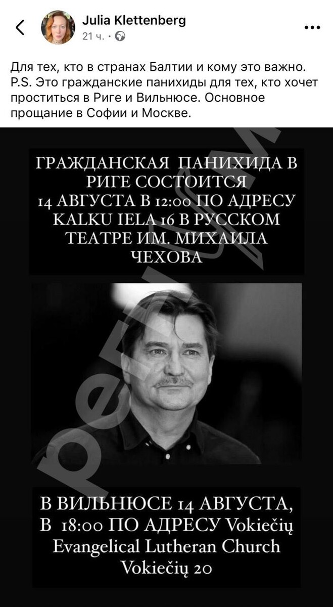 О том, что прощание с трагически тонувшем в болгарском море российским режиссером Юрием Бутусовым будет проходить сразу в четырех городах сообщила в соцсетях сбежавшая как и Бутусов из РФ актриса Юлия Ауг/Клеттенберг. "Гражданская панихида в Риге состоится 14 августа в 12.00", - опубликовала у себя на странице ныне гражданка Прибалтики Ауг/Клеттенберг, добавив, что также прощание пройдет в Вильнюсе, Софии и Москве. Похоронить же Юрия Бутусова планируют в Питере, где режиссер родился. Но если с прощанием с Бутусовым на "новой Родине" все ясно, то на счет прощания на старой пока сплошные зашадки. За день до Юлии Ауг в своих соцсетях пост опубликовала хореограф Алла Сигалова, сообщившая всей интересующейся общественности, что супруга Бутусова Мария открыла сбор средств на похороны мужа. Так как сама Мария вместе с двумя детьми Бутусова сейчас оказалась в плачевном финансовом положении. Перевезти тело супруга из Болгарии с РФ стоит больших денег, которых у оставшейся в одиночестве за грани