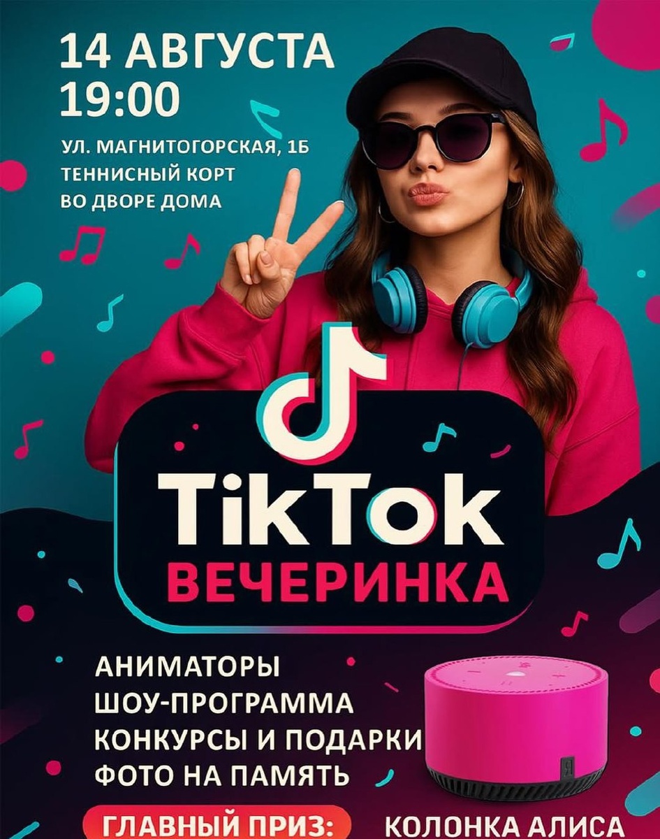 💥 ТИК-ТОК ВЗРЫВ во дворе! Танцы, Конкурсы, Подарки. Двор превращается в эпицентр самого крутого события этого лета — ТИК-ТОК ВЕЧЕРИНКА! 14 августа , Начало в в 19 :00 Прямо у вас под окнами — ЖК Екатерининский теннисный корт во дворе дома ул. Магнитогорская 1Б 1. БОМБИЧЕСКАЯ ШОУ-ПРОГРАММА: 2. ТИК-ТОК БАТТЛЫ И КОНКУРСЫ: танцевальные баттлы для всех возрастов, веселые игры и соревнования 3. ** ПОДАРКИ И ПРИЗЫ ДЛЯ ВСЕХ 4. ГЛАВНЫЙ ПРИЗ ВЕЧЕРА — УМНАЯ КОЛОНКА «АЛИСА»! 🫠 Детские мероприятия Ростов-на-Дону. Я местный!