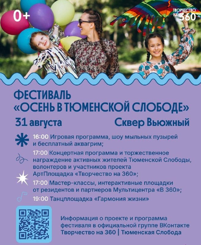 В «Тюменской Слободе» уже осень! Команда проекта АртПлощадка «Творчество на 360» приглашает всех жителей и гостей квартала Тюменской Слободы на фестиваль «Осень в Тюменской Слободе». Праздник состоится 31 августа в Сквере Вьюжный (ул. Вьюжная, 4). Это мероприятие станет ярким завершением проекта и подарит участникам незабываемые впечатления. Фестиваль начнется в 16:00 с анимационной игровой программы с шоу мыльных пузырей и бесплатным аквагримом для детей. Затем с 17:00 стартует концертная программа с выступлениями местных творческих коллективов. Для жителей и гостей Тюменской Слободы выступят воспитанники музыкальных учреждений, студий воздушной гимнастики и танцевальные коллективы. Так же в рамках концертной программы состоится торжественное подведение итогов проекта «АртПлощадка «Творчество на 360» - это чествование и награждение активных жителей Тюменской Слободы, волонтеров и партнеров. Подробнее